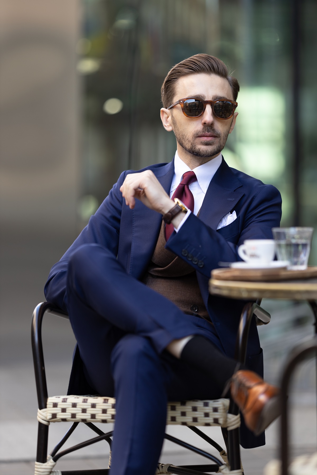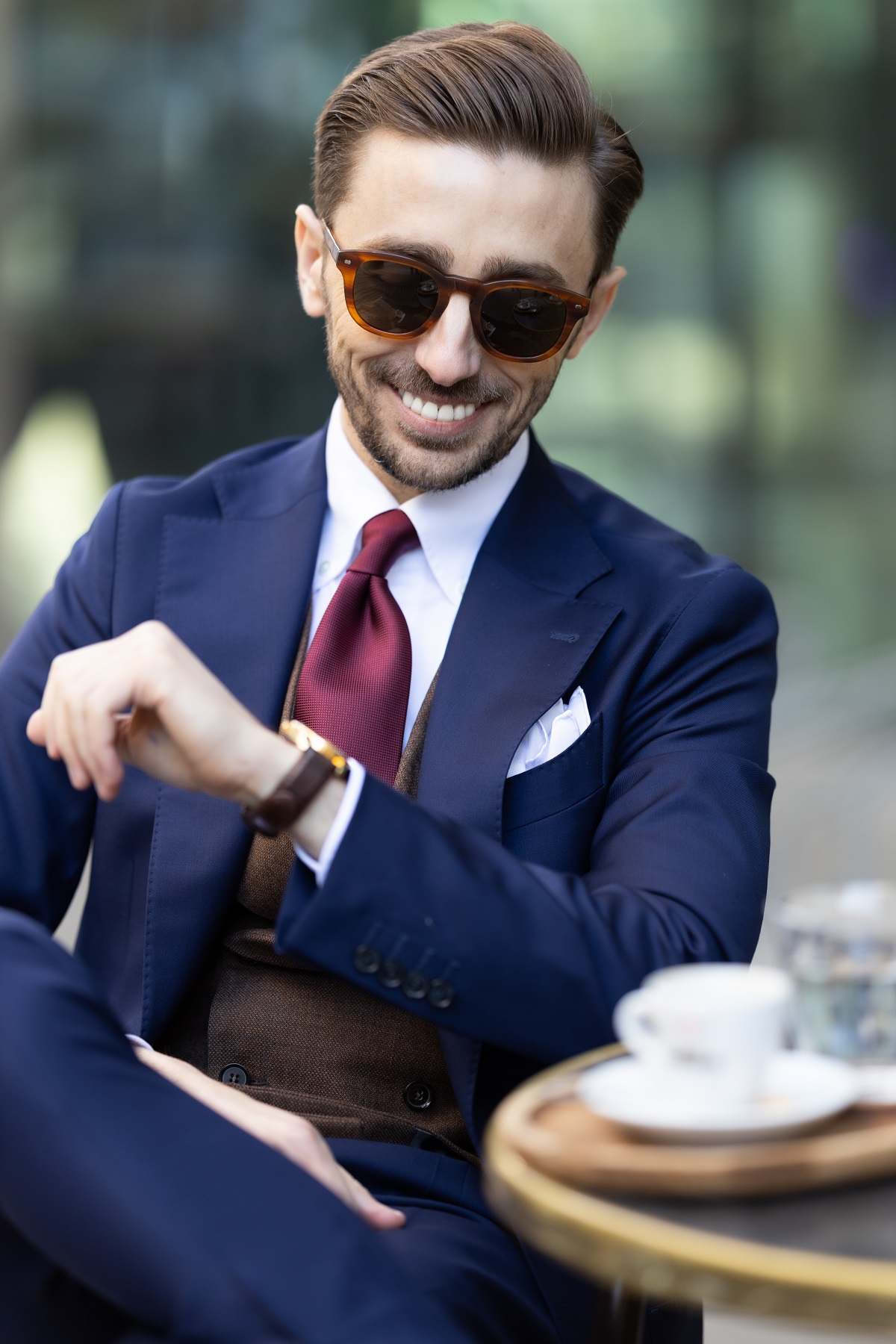 Granatowy garnitur ma sportowy charakter. Naszywane kieszenie, krótsze i węższe nogawki pozwolą nosić go latem do loafersów. Brązowa kamizelka natomiast dodaje luzu i wyrazistości. Koszula z kołnierzykiem button down dobrze prezentuje się z, jak i bez krawata, w tym przypadku postawiłem na wersje z bordowym jedwabnym zwisem.