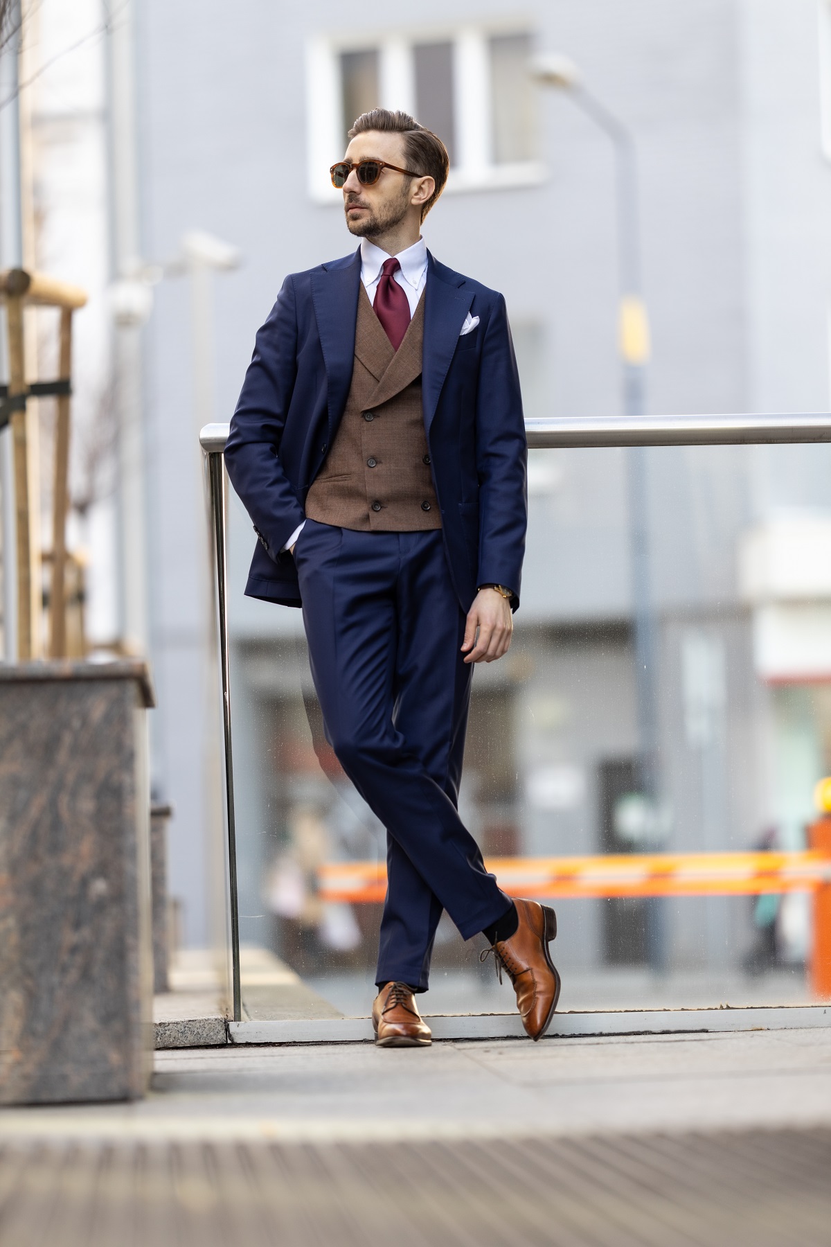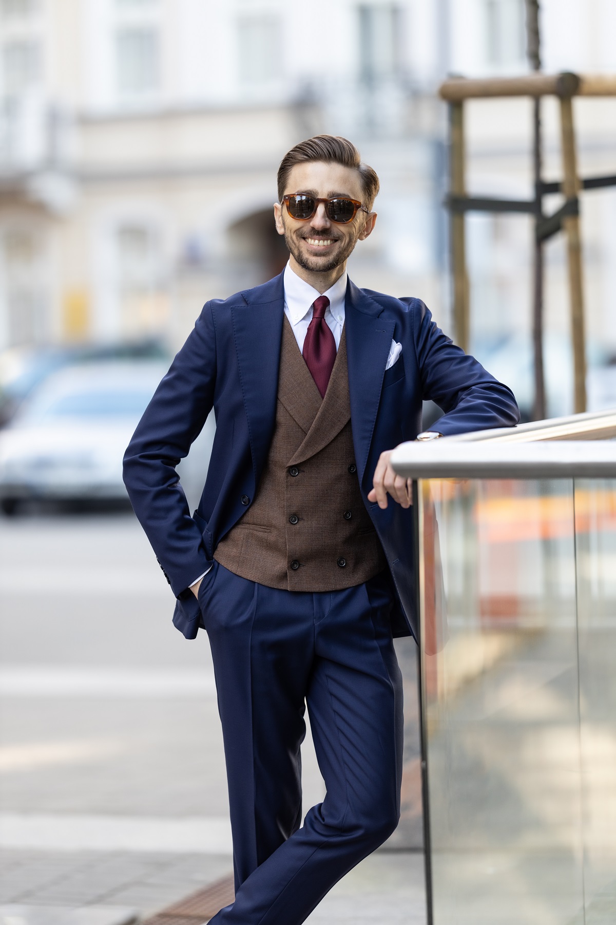 Na jakie okazje można zakładać brązową kamizelkę do granatowego garnituru? Taki zestaw sprawdzi się zarówno na ślub, jak i zestaw na co dzień. Wszystko zależy od dodatków i stylu garnituru. Przykładem udanego połączenia takiej właśnie kamizelki jest moja autorska stylizacja.