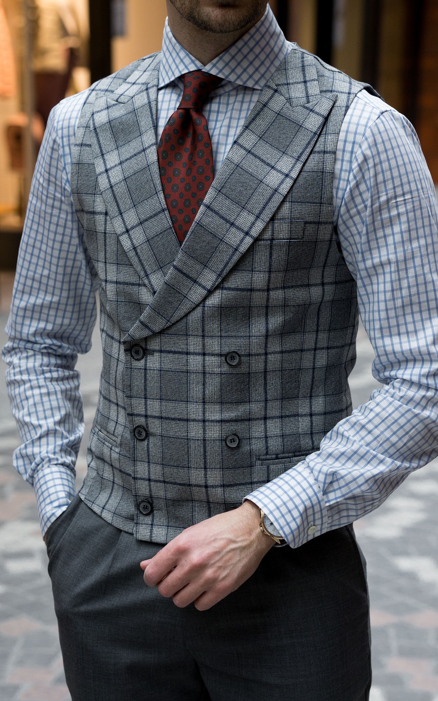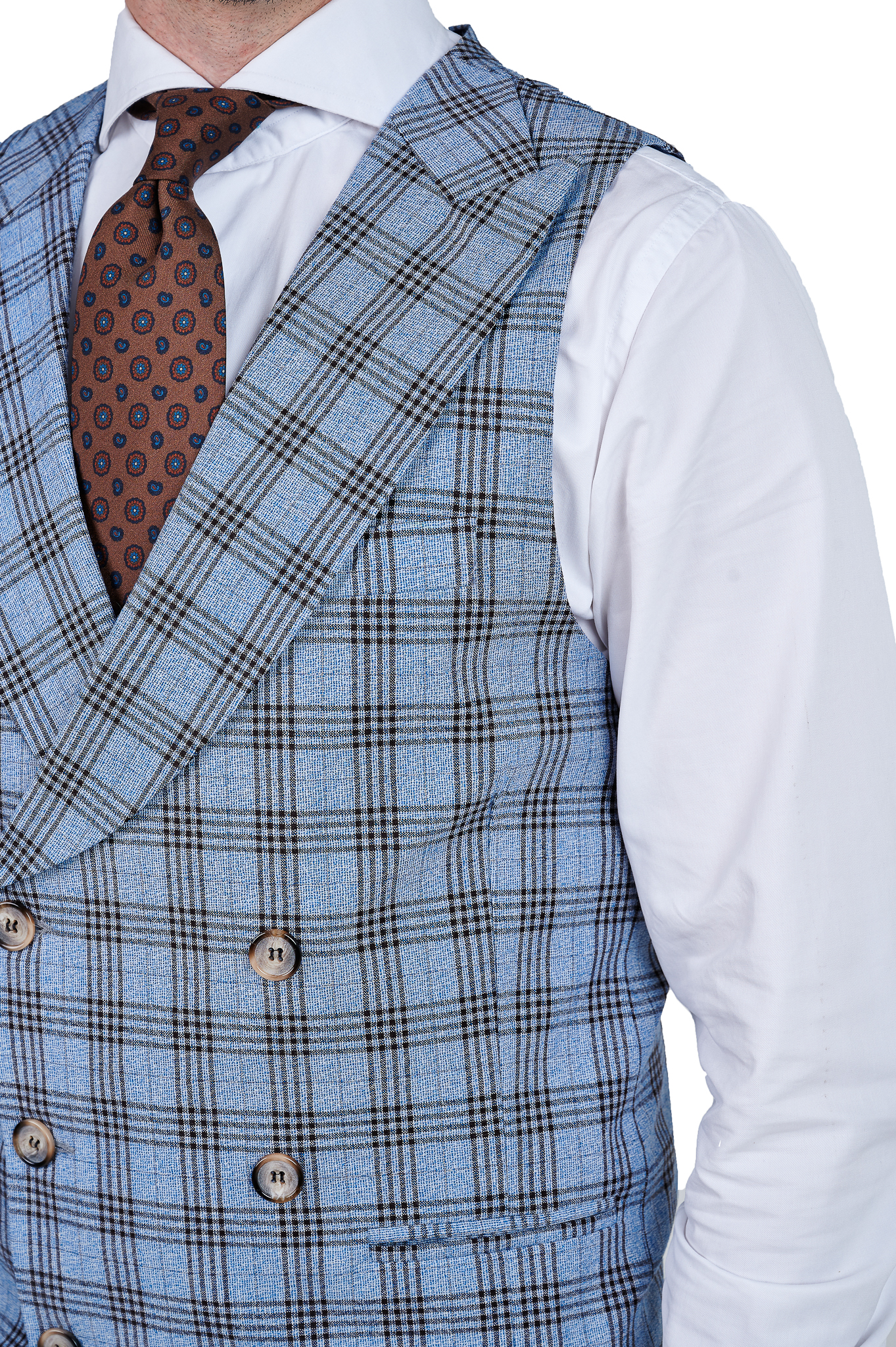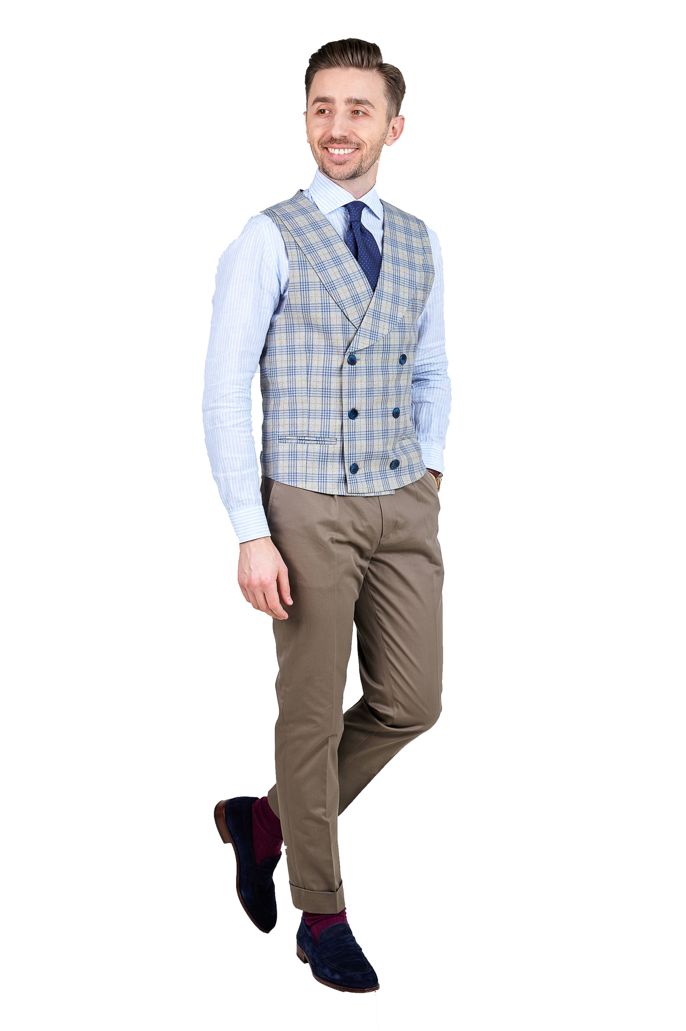 Jest to model uszyty z czystej wełny w dwurzędowym kroju z imponującymi klapami. Kamizelka ta świetnie sprawdzi się w zestawach solo, jak i w zestawach z gładką marynarką.