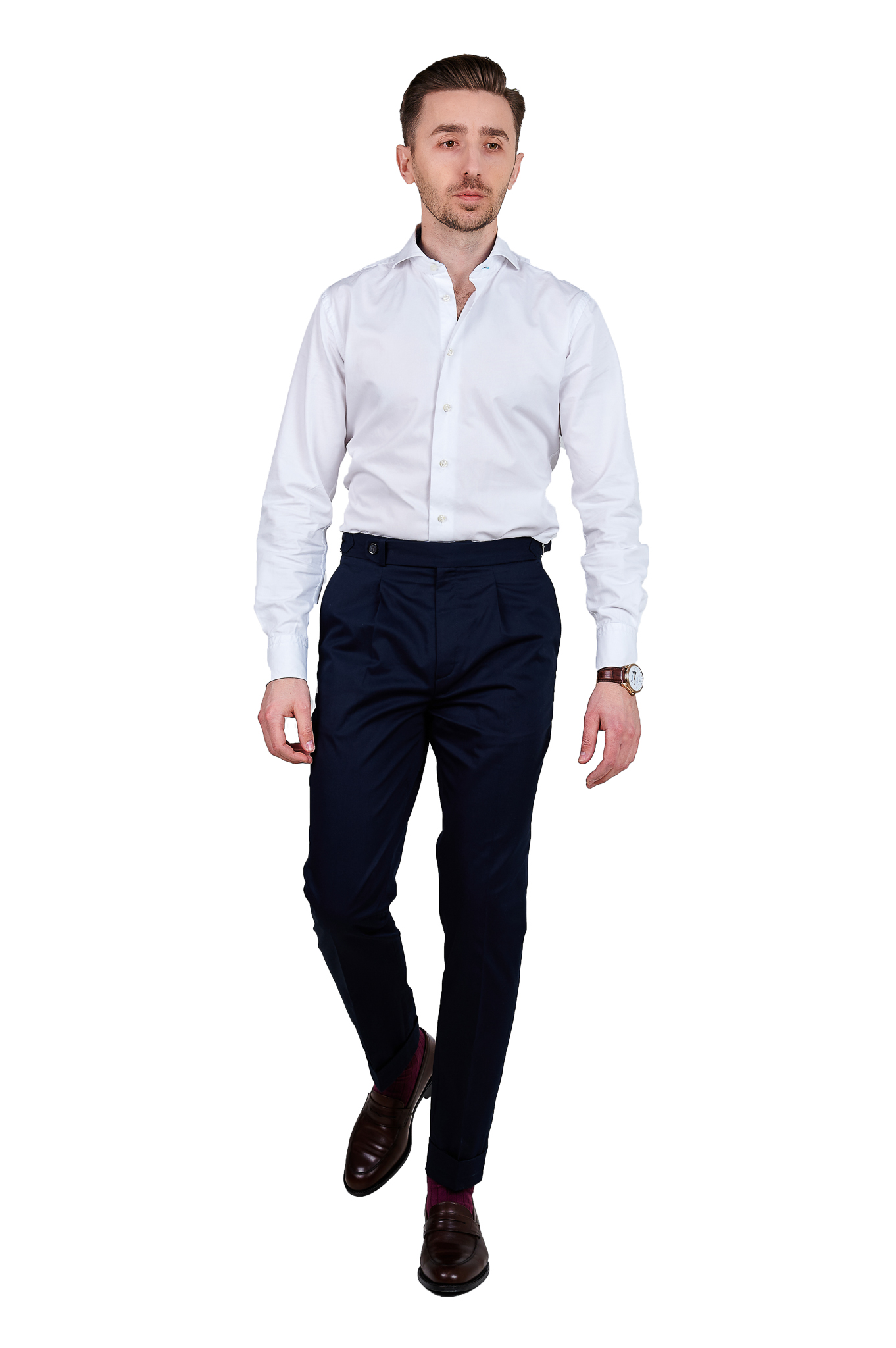 Spodnie granatowe Modena uszyte zostały z przewiewnej i plastycznej bawełny. Model ten ma wyższy stan i jedną zakładkę. Spodnie mają regulatory zamiast szlufek.