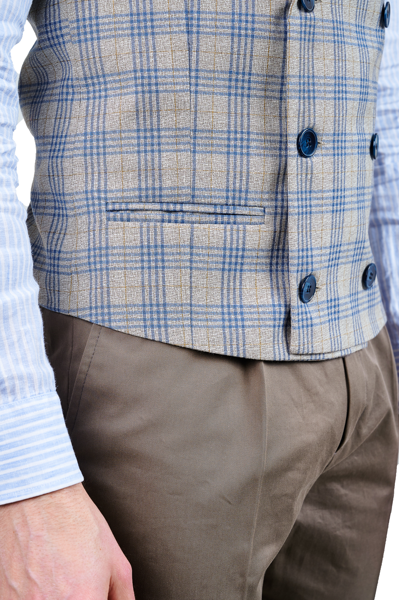 Kamizelka sienna została uszyta z wełny od Marlane w subtelną kratę. Model ten ma błękitny kolor i dwurzędowy krój. Kamizelka dodatkowo wybija się dzięki imponującym klapom.